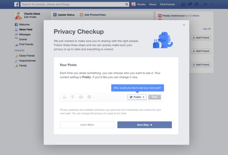A ferramenta deverá entrar em funcionamento nas próximas semanas e o pequeno dinossauro azul irá pedir ao utilizador que reveja com quem quer partilhar informação, que aplicações usa e que conteúdo no seu perfil quer manter privado. “Queremos fazer tudo para colocar nas mãos das pessoas o poder e o controlo”, sublinha o Facebook.